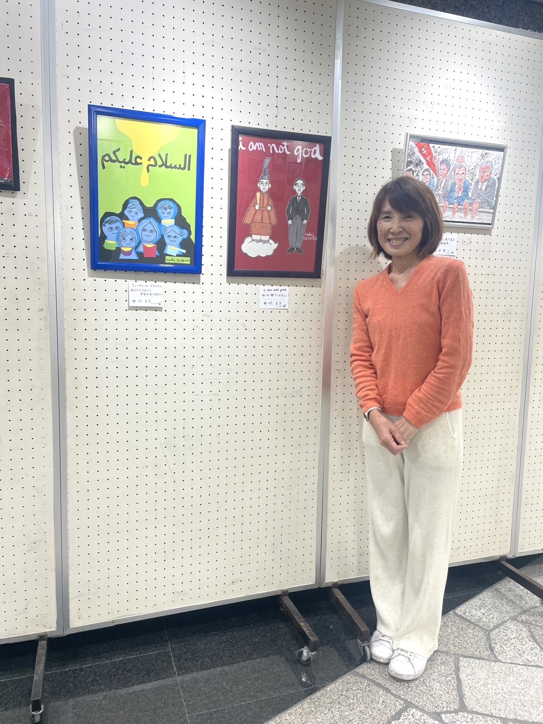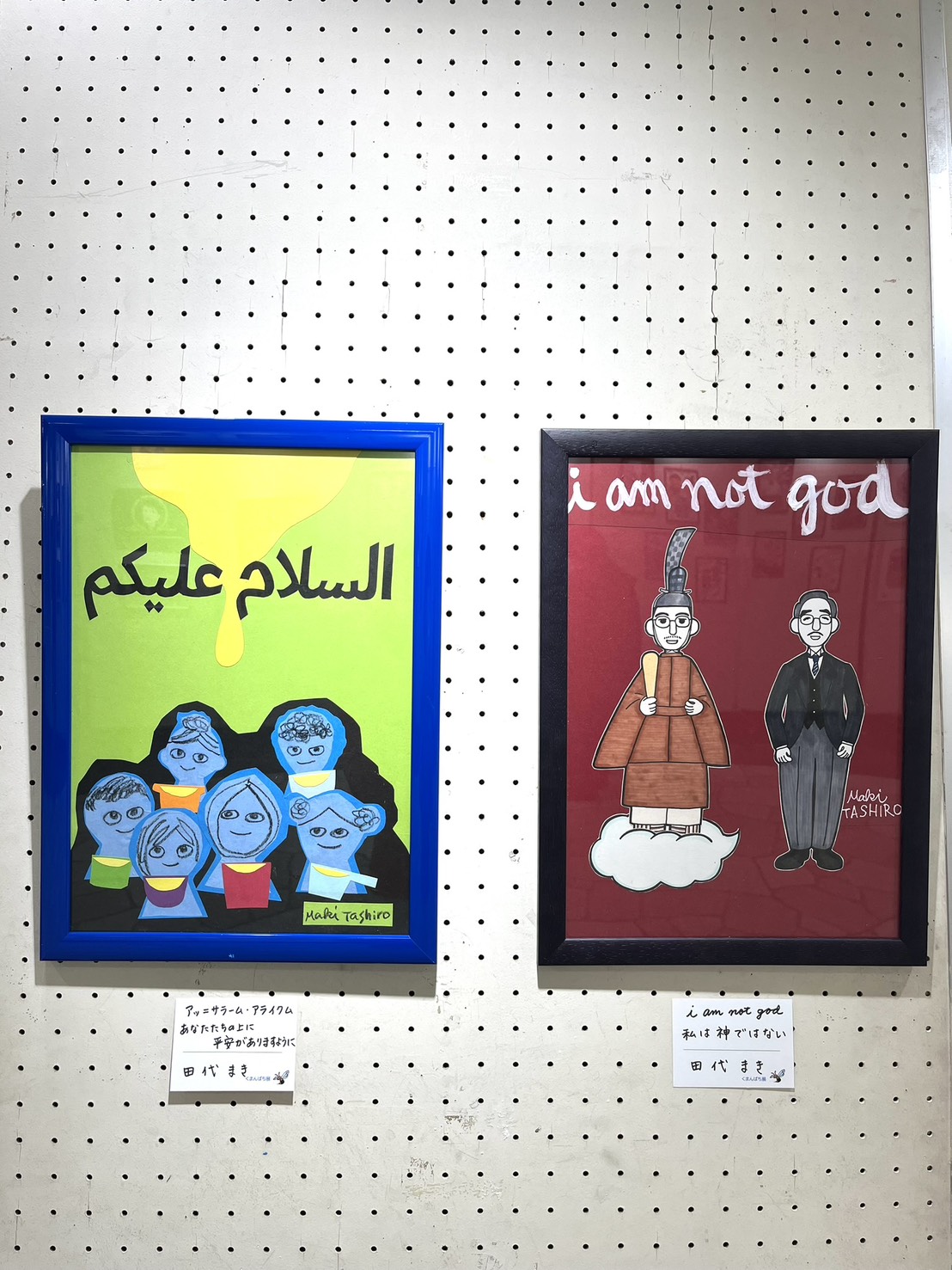 今回出展の2点、1点はアラビア語で「アッ=サラーム・アライクム あなたたちの上に平安がありますように」これは、ガザの子どもたちが、お腹いっぱいスープやごはんを食べられますように🙏と祈りを込めて描きました。もう1点は、日本漫画2025展に出した「i am not god私は神ではない」です。